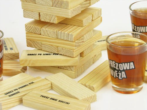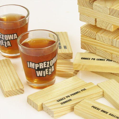 W zestawie znajdują się zarówno klocki „czyste”, jak i te z komendami 🎯 — a na połowie z nich widnieją zadania do wykonania po ich wyjęciu. Do kompletu dołączono cztery solidne kieliszki 🍷, które wykorzystuje się przy realizowaniu poleceń.