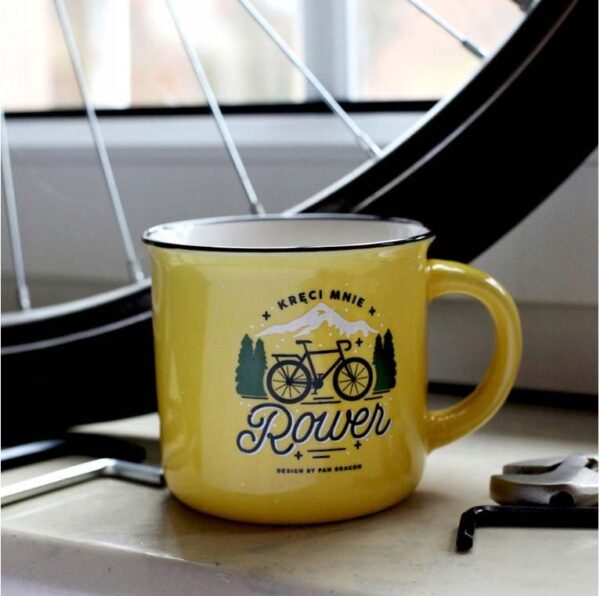 Żółty kubek ceramiczny z rowerowym motywem i hasłem „Kręci mnie Rower”. Klasyczny kształt i wyrazisty nadruk sprawiają, że świetnie sprawdzi się na co dzień – w domu, pracy lub jako prezent dla miłośnika dwóch kółek.