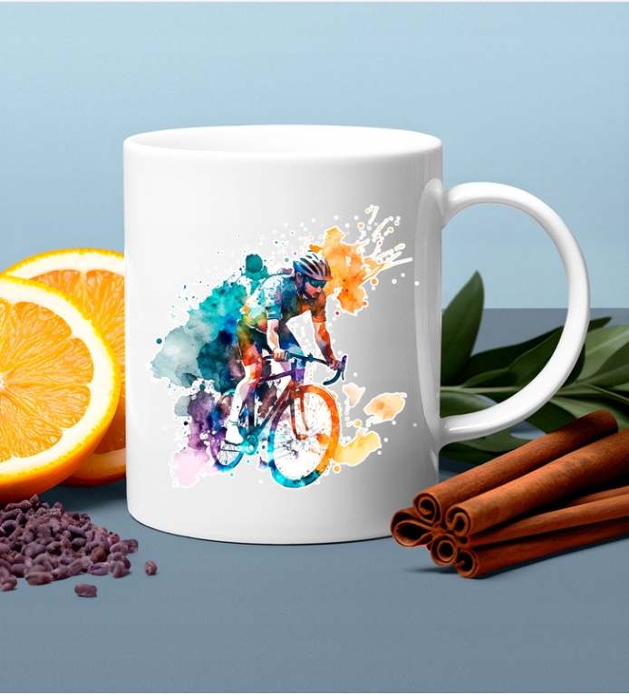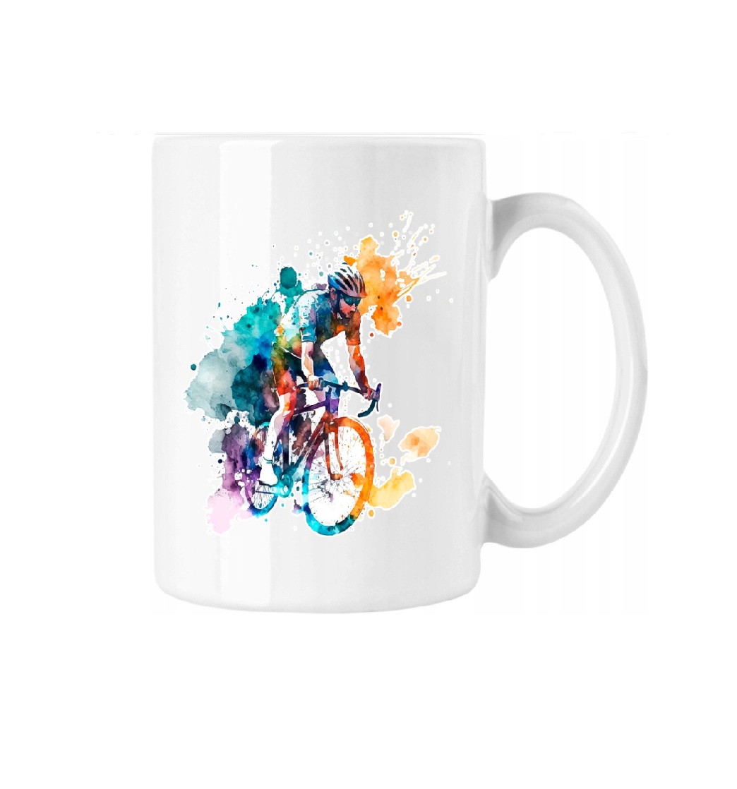 Stylowy biały kubek ceramiczny z dynamiczną ilustracją rowerzysty w artystycznym, akwarelowym stylu.