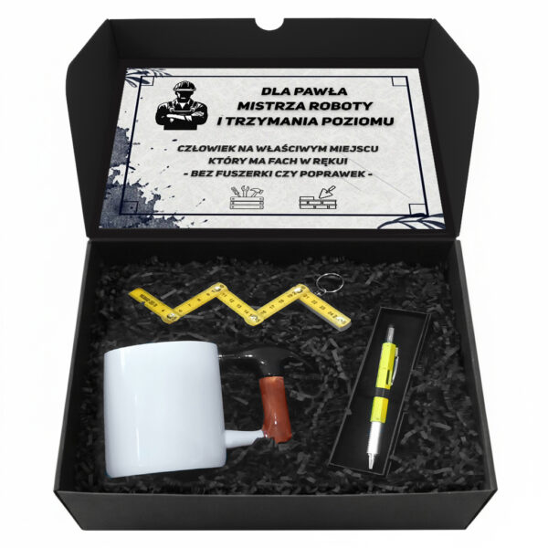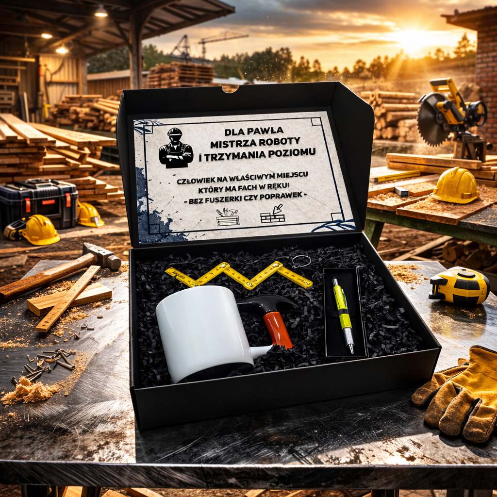 Personalizowany Zestaw prezentowy dla Budowlańca z grawerem na górze pudełka ✨ oraz osobistą dedykacją wewnątrz pudełka👌