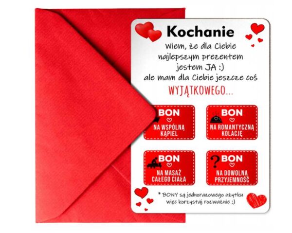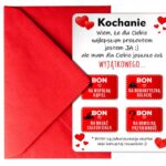 • drewniana płytka 3mm z dedykacją i bonami plus czerwona koperta.