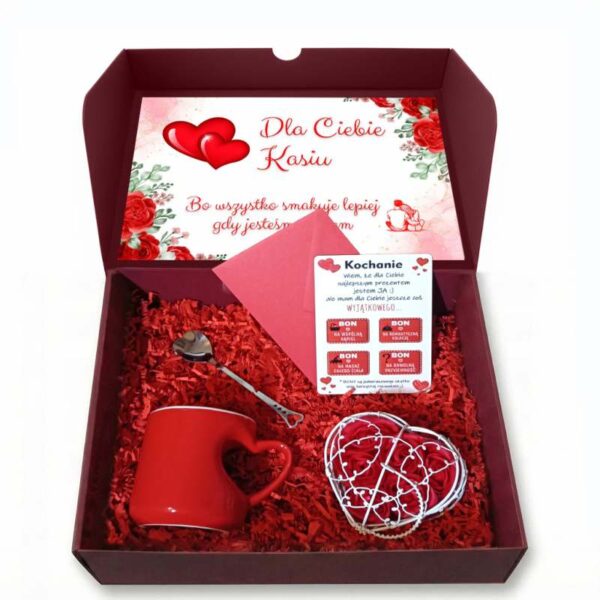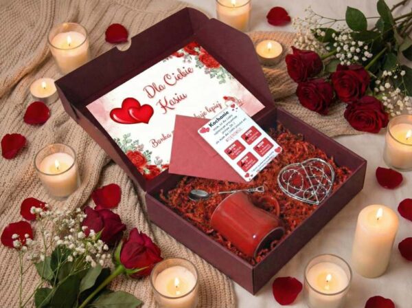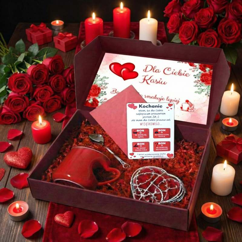 Ten wyjątkowy zestaw to idealna propozycja na romantyczny prezent ❤️ dla bliskiej osoby. Całość utrzymana jest w miłosnym, czerwonym stylu, który podkreśla wyjątkowy i uczuciowy charakter upominku 💝