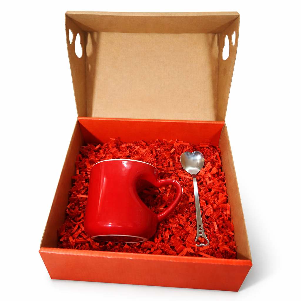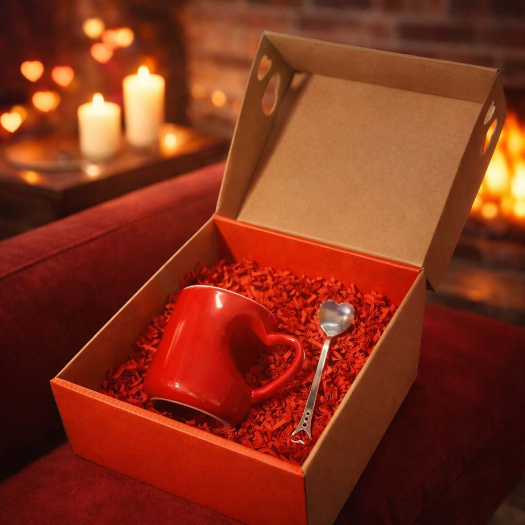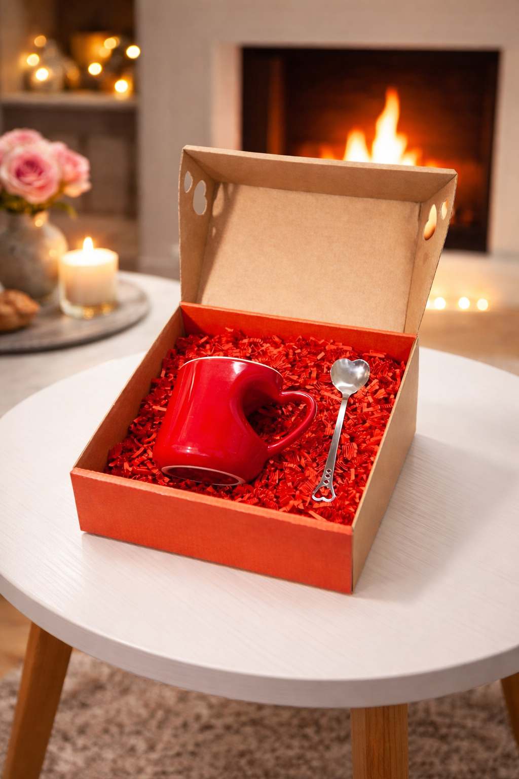 Czerwony kubek z uchem w kształcie serca ☕💖 oraz łyżeczka z motywem serca tworzą idealny duet na kawę lub herbatę. Całość zapakowana w eleganckie pudełko 🎁 – gotowa, by sprawić radość i wywołać uśmiech 😊